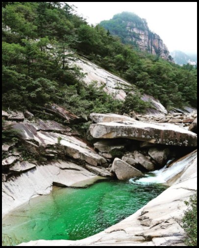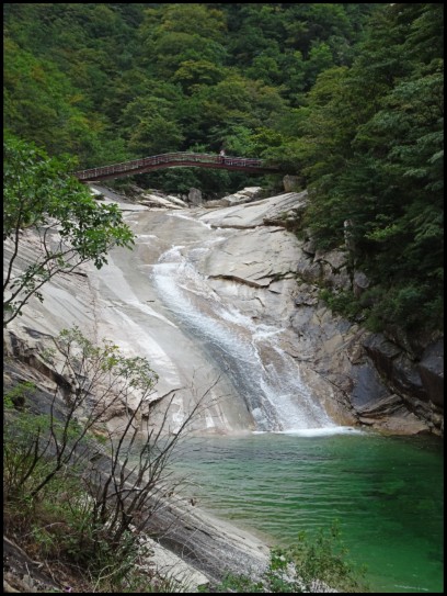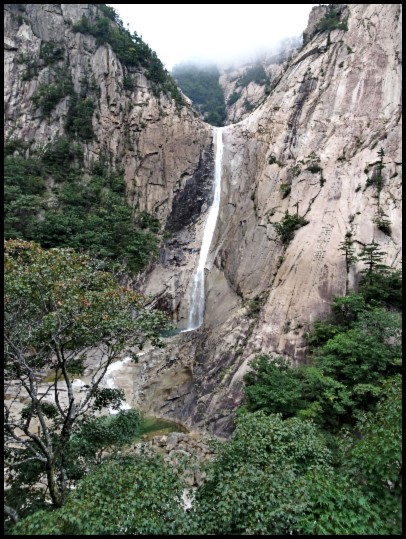 The Kuryong Falls, a national monument and a UNESCO declared Biosphere Reserve, has a drop of 74 metres across about 84 metres, making it not quite vertical. The falls flow all year round, into a large pond about 13 metres deep. Legend has it that nine dragons once lived in the pond guarding Mt Kumgang. Kuryong means nine dragons.